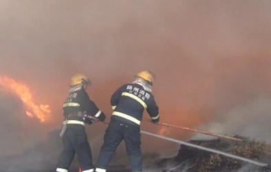江蘇省揚州市一處堆放竹條的倉庫突然起火,風干的竹條大面積燃燒,濃煙籠罩,當地消防部門接警,立即前往撲救。